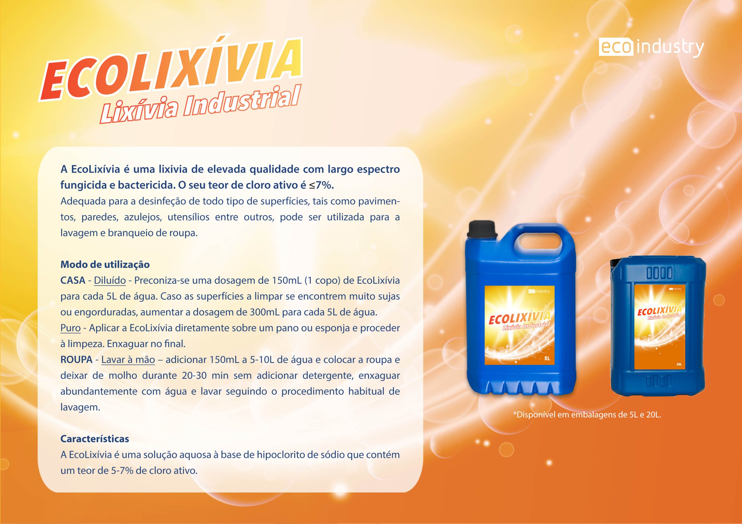 Ecolixívia é uma lixívia industrial formulada com um teor de cloro activo até 7%, garantindo acção eficaz contra germes, fungos e bactérias. Indicada para limpezas intensas de superfícies e utensílios ou para lavagem e branqueamento de roupa.